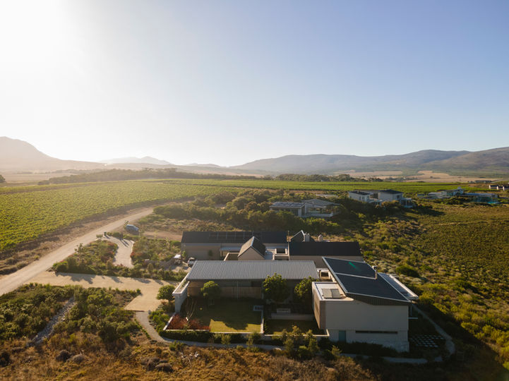 House Pieterse, elegantly situated within Benguela Cove Wine Estate, embodies sustainable vernacular architecture with contemporary flair. Positioned on a prime plot overlooking the serene Botrivier estuary and mouth, the residence maximizes breathtaking views and meticulously integrates natural light.